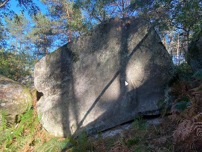 On the boulder underneath Cellulose, above La Route des Gorges de Franchard, 10m before the crossing with la Route de la Chouette. Standing start with a vertical ledge right hand, dyno to a crimp left hand and exit above.