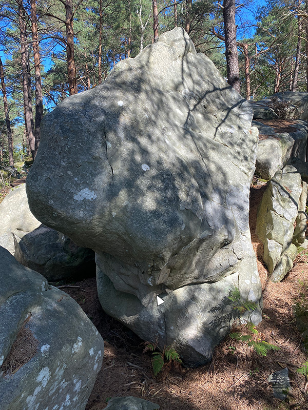 Central problem on a boulder just under the crest before La Route Henriquez. Sitstart and exit directly with a thin crack and the right arete of Le Pilier de Noël.