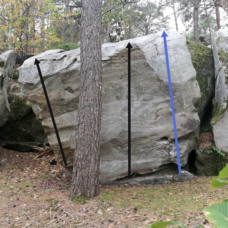 Voie de droite sur le bloc d'Ère Glaciaire, 40m à l'Est de La Pervenche Citronnelle. Partir assis et sortir avec un bac au sommet.