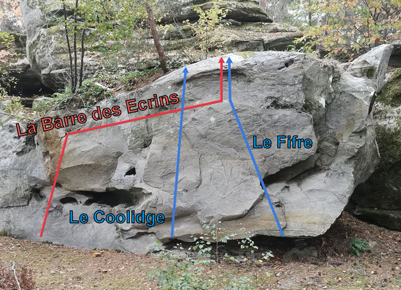 Sur le bloc 5m à gauche d'Ère Glaciaire. Partir assis, traverser à droite sur la rampe et sortir au sommet comme pour Le Fifre.