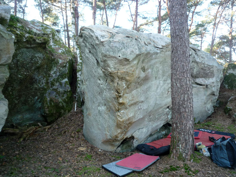 Voie de gauche sur le bloc d'Ère Glaciaire, 40m à l'Est de La Pervenche Citronnelle. Partir assis et remonter la proue à l'aide d'un monodoigt MD.
