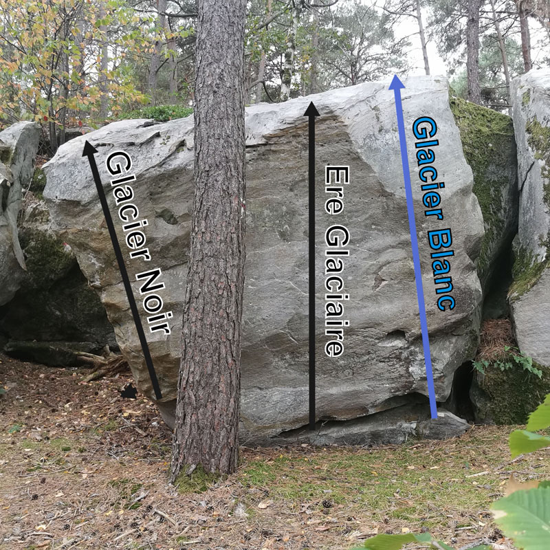 Voie de droite sur le bloc d'Ère Glaciaire, 40m à l'Est de La Pervenche Citronnelle. Partir assis et sortir avec un bac au sommet.