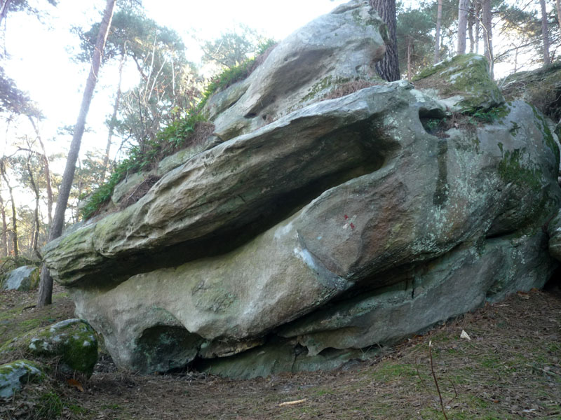 Sur le second bloc à gauche de La Barre des Écrins. Partir assis à gauche du petit bloc, aller directement sur la lèvre supérieure, traverser à droite et sortir par Mauvaise Route.