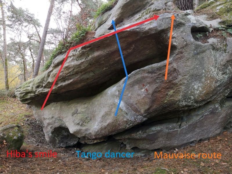 Sur le bloc à gauche de La Barre des Écrins. Partir assis à gauche du petit bloc, aller directement sur la lèvre supérieure, traverser à droite et sortir par Mauvaise Route.