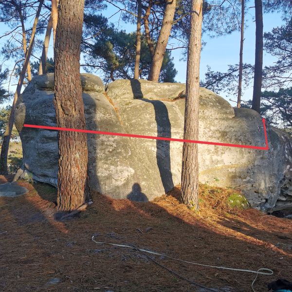 40m au Nord de Tonton Mouton, le long du GR. Partir debout à gauche du bloc comme pour Ankylosaure, traverser à droite et sortir comme pour Microraptor.