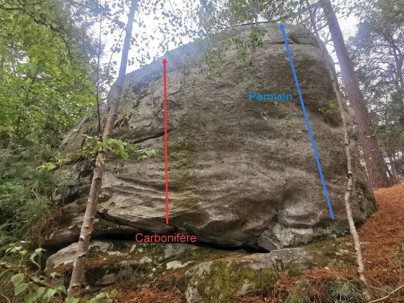 Sur l'envers du bloc d'Archaeopteryx, à gauche de Permien. Partir debout avec les deux mains dans la fissure horizontale et sortir au-dessus.