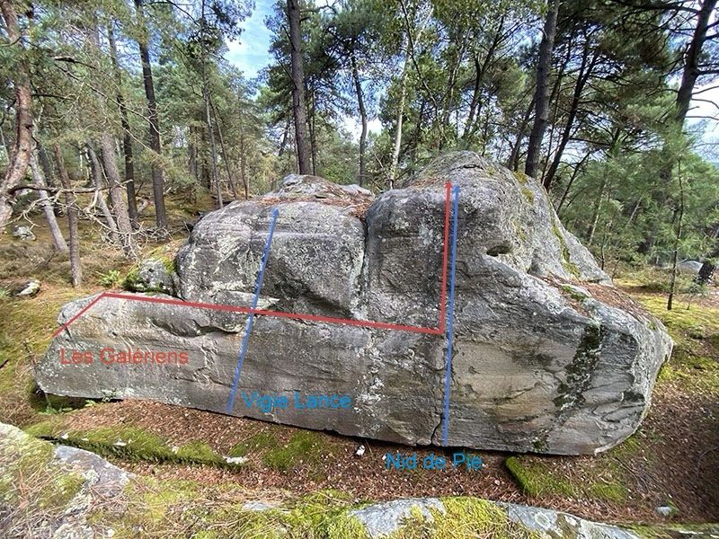Sur le bloc de Vigie Lance. Partir assis de l'angle de gauche, traverser a droite et sortir comme pour Nid de Pie.
