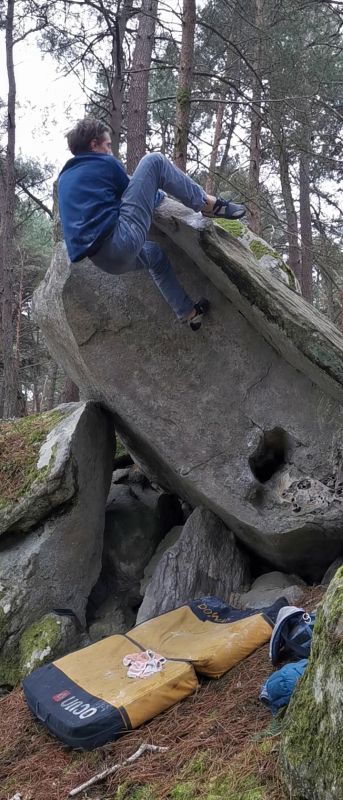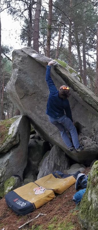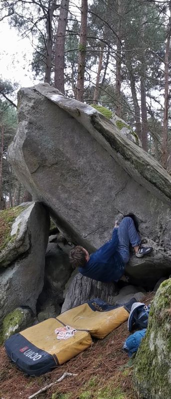 20m en dessous de La Prouhistoire. Partir assis avec deux inversées, remonter le dévers et sortir en réta.