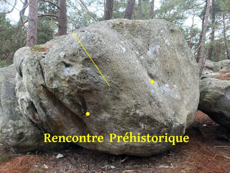 Le long du chemin principal, 20m au Sud de La Prouhistoire. Partir assis (en utilisant un crash-pad si nécessaire) avec une réglette verticale MG et un plat MD et sortir au dessus en réta.