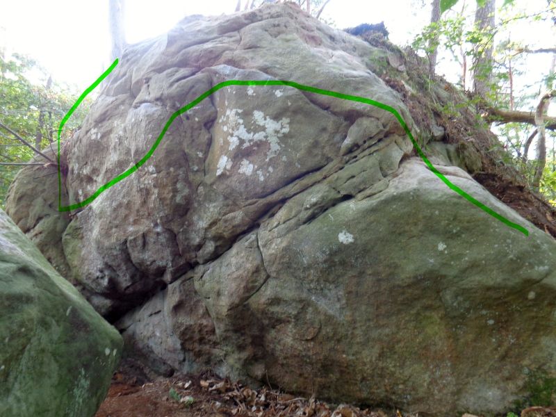En face de la sortie de La Valse des Plats. Partir assis de l'angle de droite, remonter le dévers, redescendre au niveau d'une fissure horizontale et sortir au niveau de la fissure verticale.