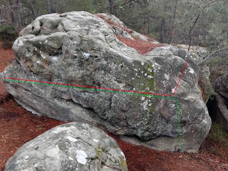 Sur le bloc en face de 30,48 Mètres Visibles. Partir assis à droite, traverser à gauche au ras du sol jusqu'à avoir les deux mains sur l'angle de gauche et repartir à droite dans Le Grand Nain Porte Quoi (retour).