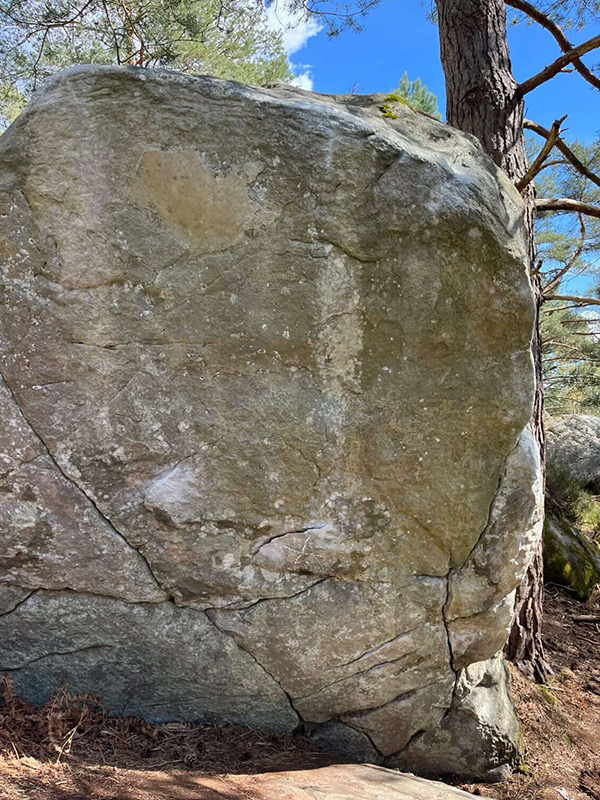 Sur le bloc à droite de PlanetSolar, à gauche de celui de La Vire à Bécane (n°29 orange), dans la partie Est du massif. Partir assis avec des réglettes et sortir sans l'arête. NB : la prise de départ MD est devenue très fragile.