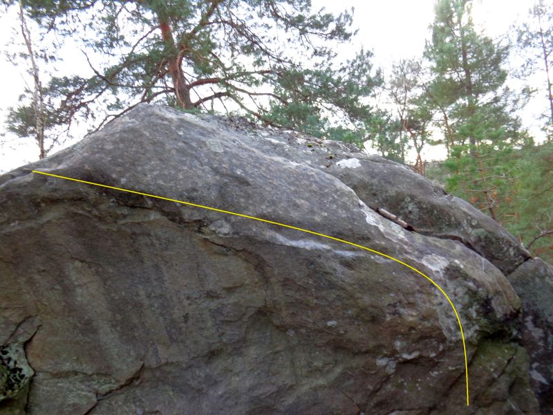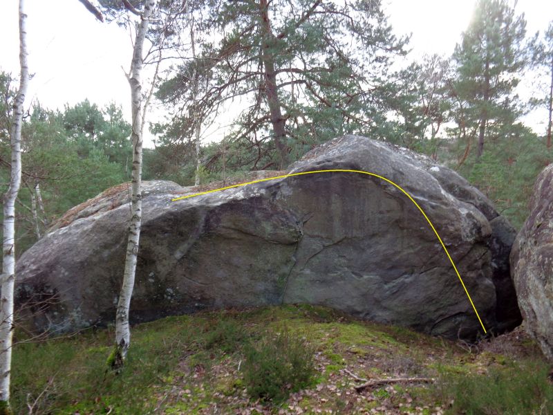 Sur le bloc en face de Escapade (n°38 rouge). Partir assis à l'extrémité droite, traverser à gauche avec les mains sur le rebord (sans les bonnes prises derrière) et sortir 2m avant l'angle de gauche (même difficulté en sortant à l'angle).