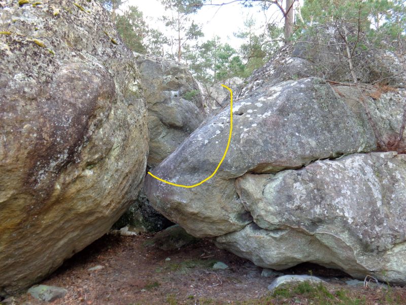 5m à droite du départ de Petit Arrangement Avec les Tiques, de l'autre côté du bloc. Partir assis juste à droite du bloc au sol avec des plats, remonter la proue directement et sortir à gauche.