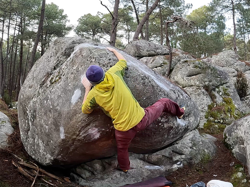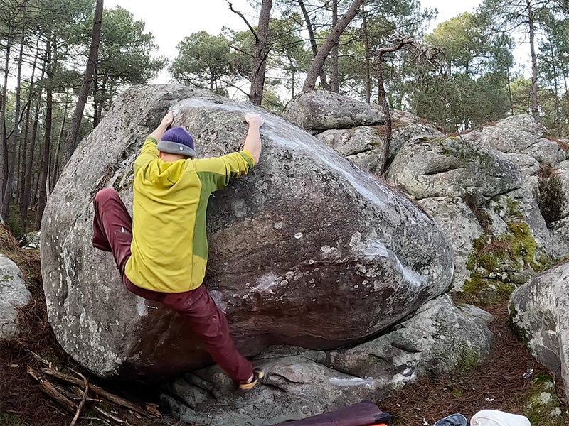 Petite proue située 20m au dessus de Horizon Perdu, 10m au Sud de Microclimat, complètement à l'Est du massif. Partir assis, remonter le dévers en compression sur des plats et sortir légèrement à gauche.