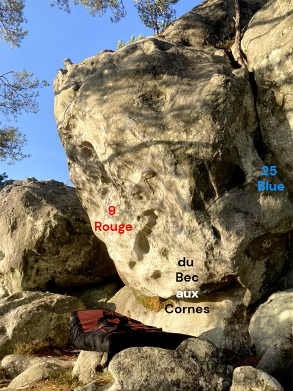 Partir assis sans le bloc de soutien au pied de l'angle entre Le Secret de la Licorne (n°9 rouge) et La Fissure du Bec (n°25 bleu) avec les prises près du point bleu, remonter le mur vers la gauche et sortir dans Le Secret de la Licorne (n°9 rouge).