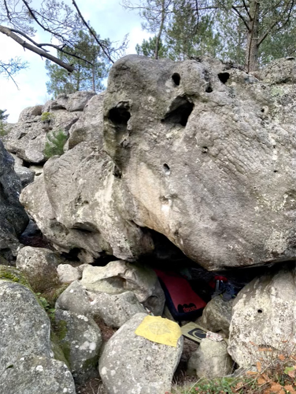 Sur le bloc au Sud du Dévers (n°34 bleu), sur la face Sud du bloc de Morphomaniacs, de l'autre côté du toit de ce dernier. Partir dans le toit et sortir au plus haut sur des bonnes prises. NB : le toit peut rester humide après une longue période de pluie.