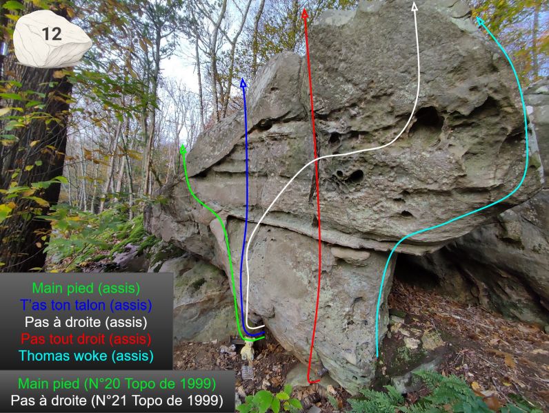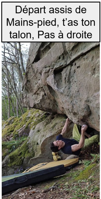 Partir assis dans la cavité comme pour Pas à Droite (assis), remonter le dévers, traverser vers la gauche et sortir comme pour Main-Pied (n°20 enchaînement virtuel non fléché).
