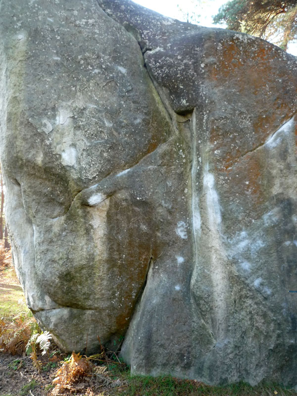 Fissure évidente sur le gros bloc de La Merveille (bloc marqué "B"). Partir assis avec une bonne prise MG et suivre la fissure jusqu’en haut.