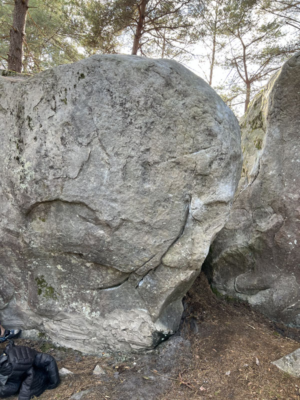 Above and to the left of Mon Cochon. To the left of Gummy Bear and 10m behind Emerald Sword. Sitstart, climb the prow with the arete right hand and crimps left hand and mantle up on slopers.