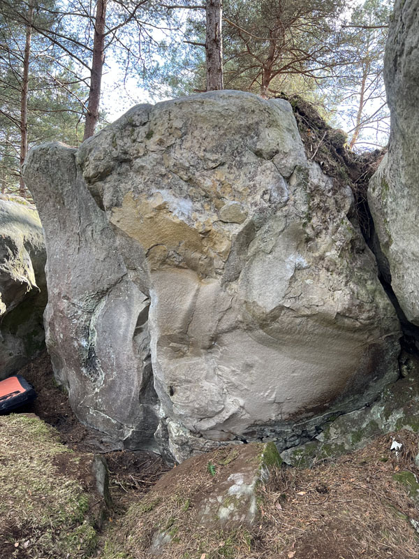 On the right of Poireau, on the boulder in between Brocoli and Gummy Bear. Sitstart with the arete left hand arete and a crimp right hand and exit above.