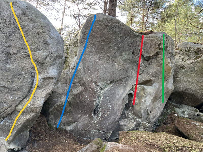 In between Carotte and Courgette, on the boulder to the right of Brocoli. Sitstart on the stone with underclings, climb the wall and mantle up above.