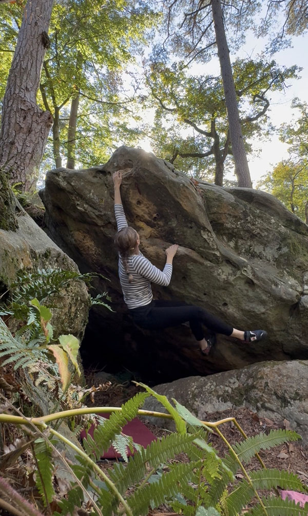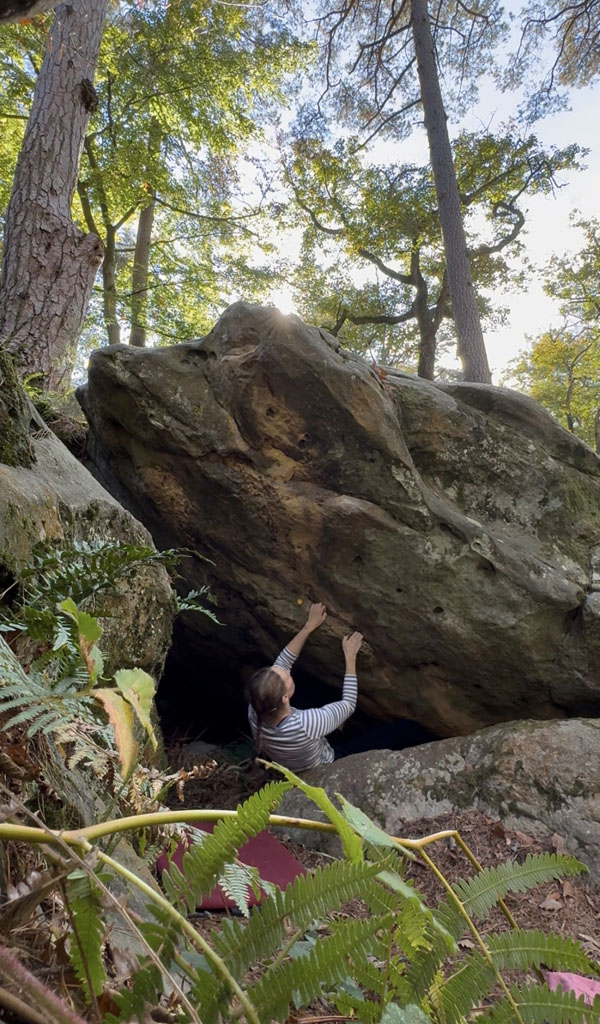 Partir couché sans crash-pad sur la pierre avec deux réglettes à droite du point jaune, remonter les dévers sur des plats et sortir en réta dans Le Saut (n°31 jaune).