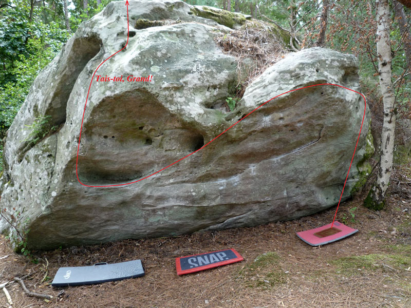 Partir assis tout à droite dans une petite fosse avec des réglettes, remonter le dévers, traverser à gauche par le haut à l'aide de trous, redescendre au niveau du départ de Fais-Toi P'tit et sortir juste au dessus dans le facette de gauche.