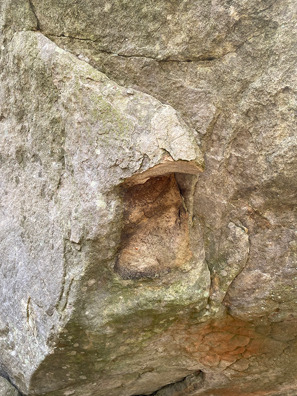 Voie de gauche sur un bloc au Sud-Est du Majestueux. Partir debout avec la grosse écaille MD et une verticale MG et sortir directement. NB : une grande partie de la grosse écaille a disparu et la voie est maintenant plus difficile que 7b.