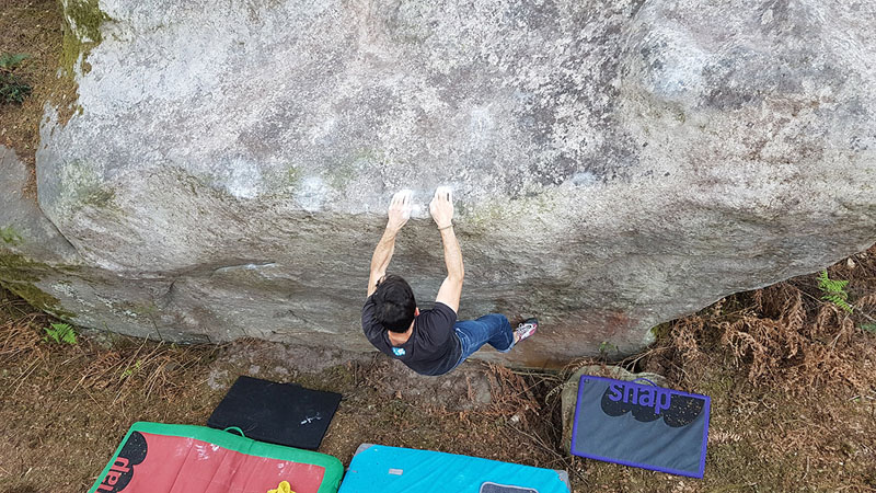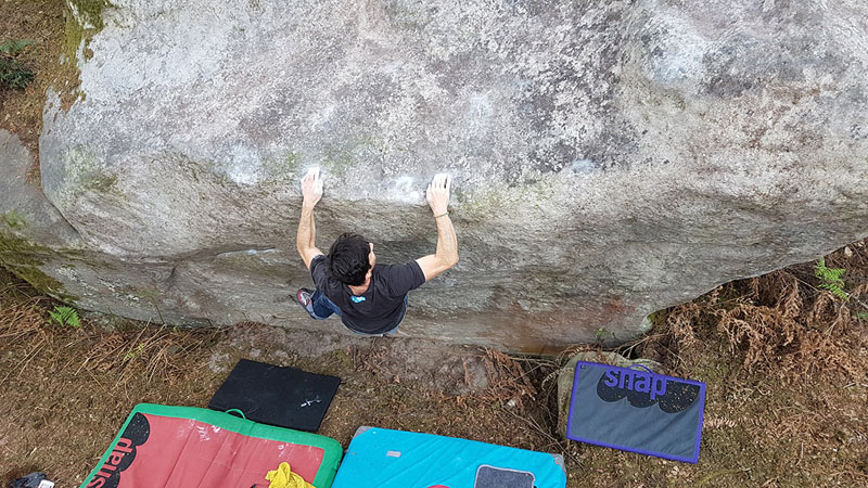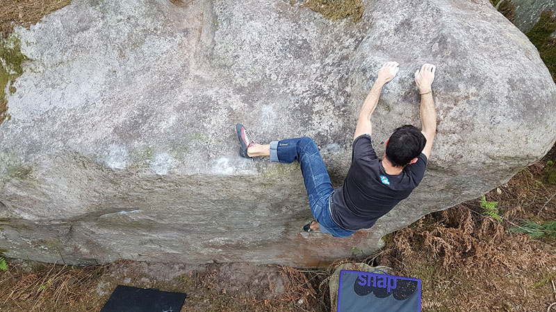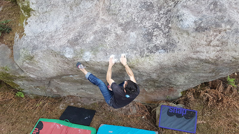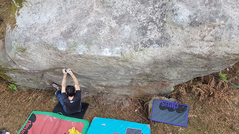 Sur le bloc juste au Nord de La Traversée d'Hekla, 100m au dessus de Tonnerre Volé. Partir assis avec une réglette évidente comme pour Kalahari, traverser à droite sur le rebord et sortir tout au bout.