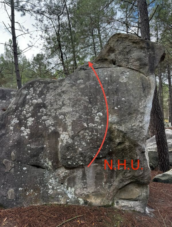 Sur la face de gauche de La Casquette (n°8 orange). Partir debout avec MD sur l'arête, remonter le mur et finir légèrement sur la gauche.