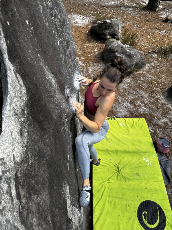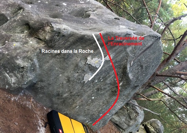 Sur le bloc du n°4 jaune. Partir assis sur la droite du bloc avec une bonne prise, traverser sur la gauche avec les réglettes marbrées jusqu'à la verticale sur l'arête de gauche et sortir comme pour Racines dans la Roche.