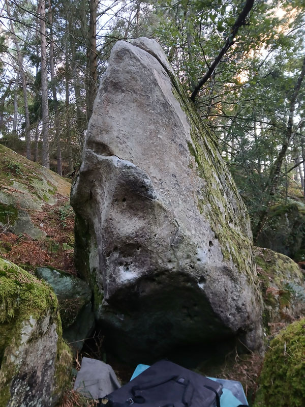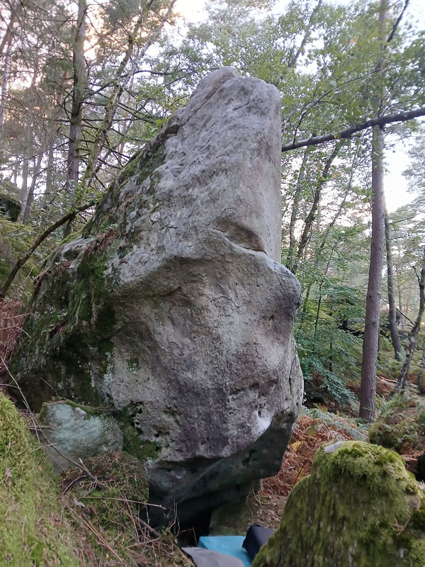Sur un bloc isolé, environ 150m à l'Ouest de Monaco, en dessous du sommet du pignon noté 133. Partir assis avec un trou évident MD et un autre trou dans le dévers MG, rejoindre le nez et sortir dans la face de gauche avec l'arête en MD.