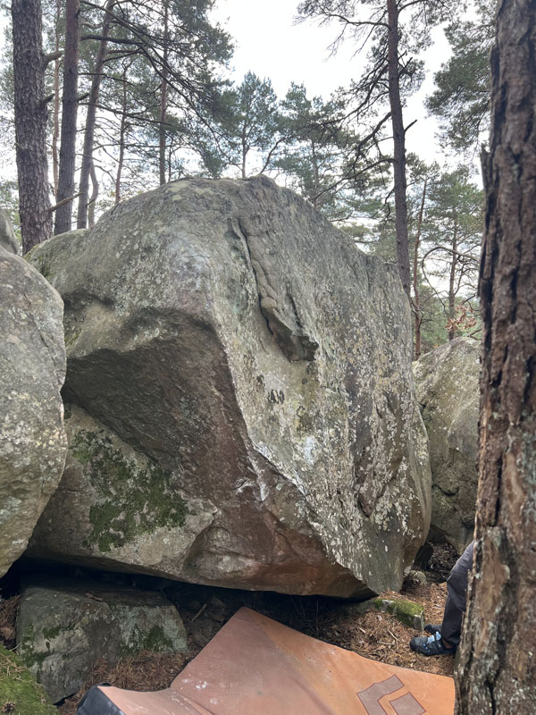 Sur le bloc juste à droite de Mignon, tout en haut, juste en dessous du sentier bleu, au dessus de La Reclosiote. Partir assis avec l'arête MG et une réglette MD et sortir au dessus.