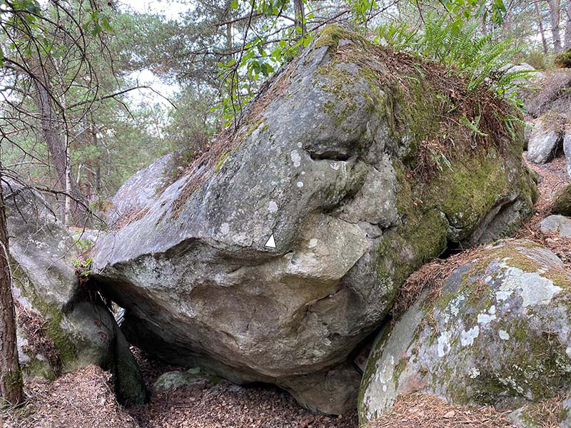 Entre n°6 bleu et n°7 bleu, sur le bloc juste au dessus de Jules Verne. Remonter l'arête sans utiliser le petit bloc de droite.