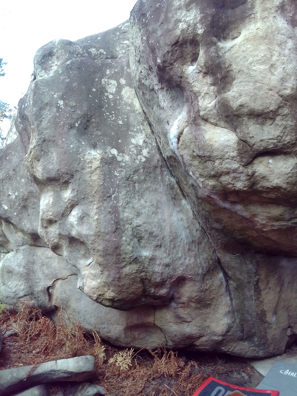 Entre L'Oubliée et La Souveraine, à gauche de Noir Désir. Partir avec la fissure MG et un trou horizontal MD, remonter la fissure et sortir sur sa gauche sans utiliser le gros bac de La Souveraine dans le mur à droite.
