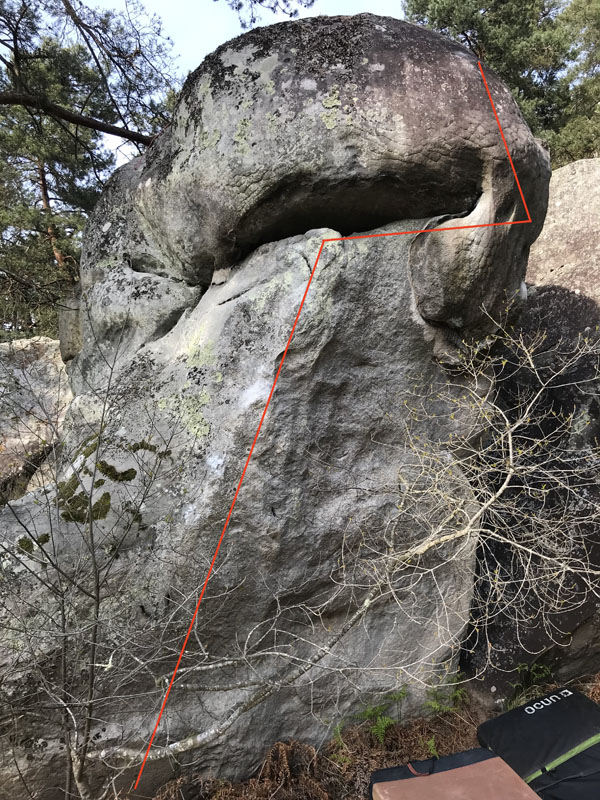 Juste en dessous du sentier bleu n°5, entre T-Rex et C'Était Demain. Remonter l'arête à gauche de la proue de Raid Aérien, traverser à droite et rejoindre la sortie de ce dernier.