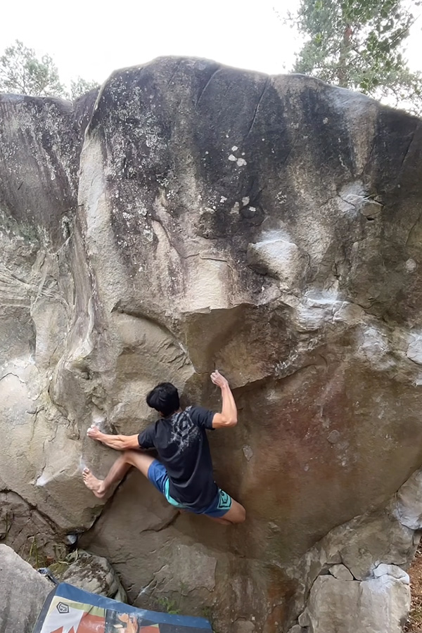 Sur la crête Nord, entre La Grande Arête (n°15 rouge) et La Voie de la Fin (n°16 rouge). Partir assis à gauche avec des verticales, remonter le dévers vers la droite et sortir dans Salathé Wall.