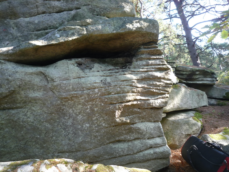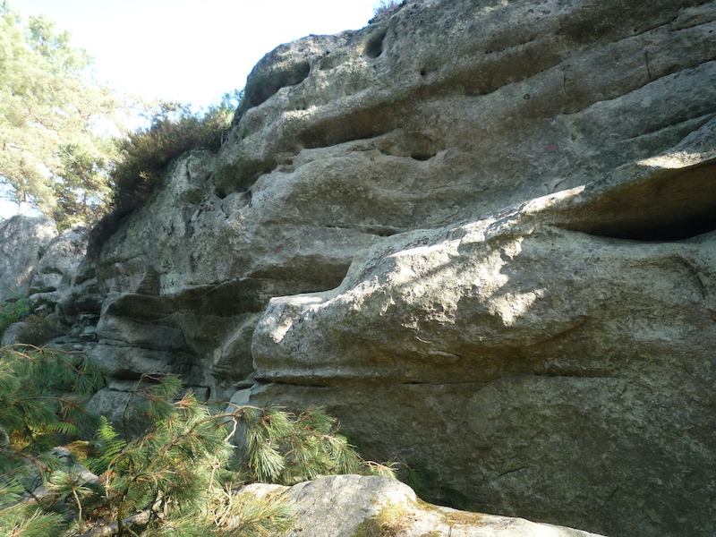 Just under the blue path, above and to the right of L'Imparable (red n°34). Start as for Pierre Tombée, traverse to the right on slopers and exit to the right at the angle. NB: lichened (October 2025).