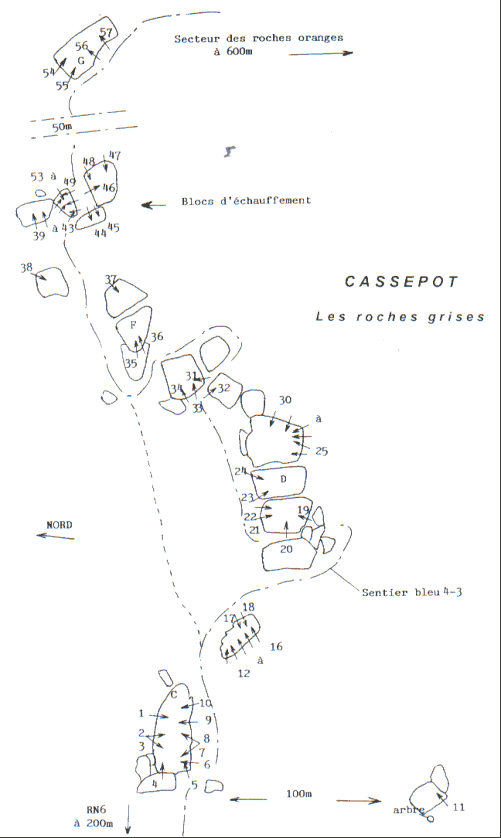 Accès : De Fontainebleau, prendre la RN6 en direction de Melun sur 3km. 800m après la descente et tout de suite après la première courbe à droite, stationner sur la droite au niveau de la route forestière de Luxembourg. Emprunter ensuite le sentier bleu 4-3 qui démarre à l'angle droit de cette route et le remonter sur 200m. Le premier bloc est sur la gauche (lettre C)
