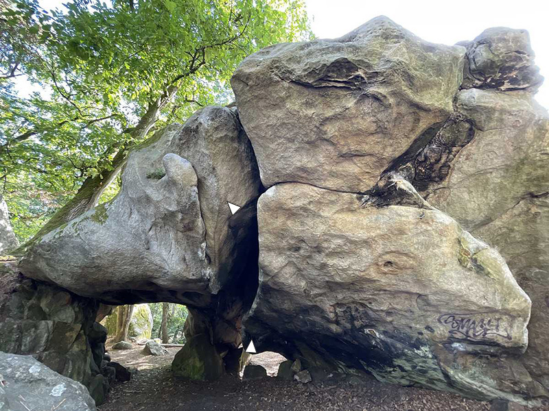 Partir assis sous Ussy Peur (n°10 rouge) en bas de la cheminée déversante noircie par d'anciens feux, remonter celle-ci (éventuellement à l'aide de coincements) et sortir à gauche dans Ussy Peur (n°10 rouge).