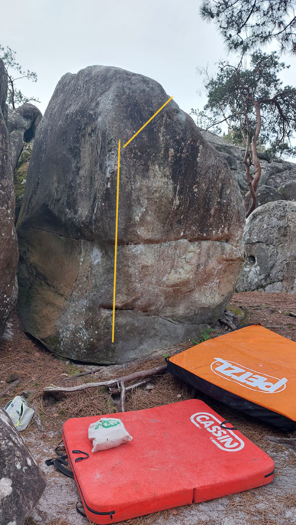Sur le bloc au Nord-Est de L'As Tactique (n°5 bleu). Partir debout avec une pince et une réglette sur l'arête et remonter la proue vers la droite. NB : première réalisation connue par Lea Fortin.